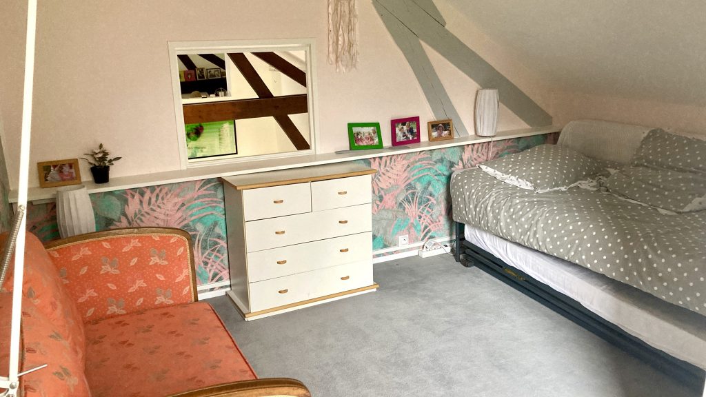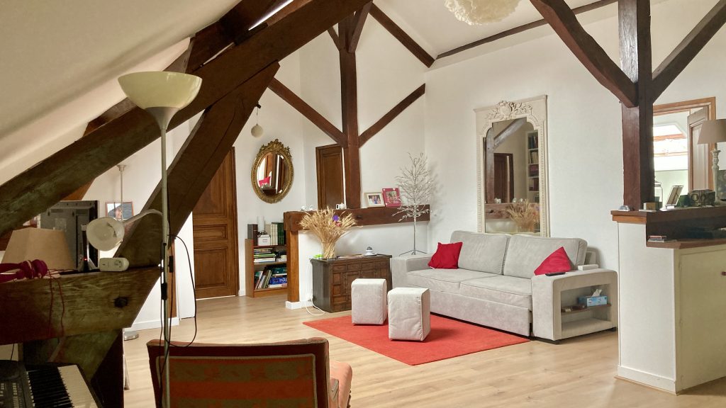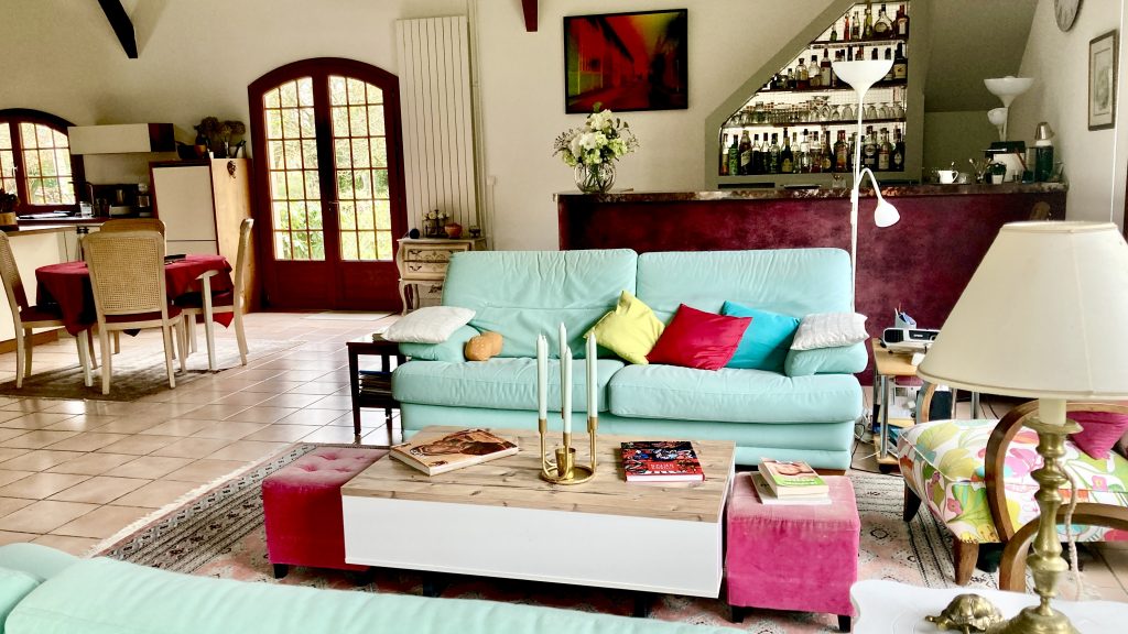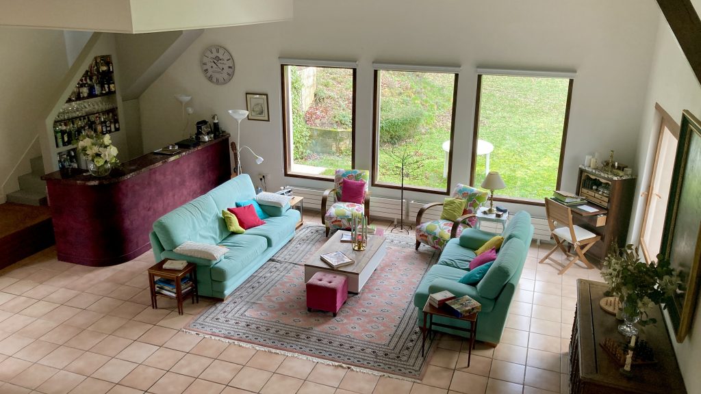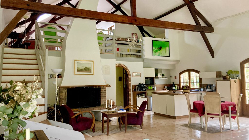 Un large salon de 75 m2 pour nous réunir le soir, une grande cheminée pour les flambées d’hiver, un salon privé en mezzanine pour plus d’intimité et les chambres pour s’isoler au besoin. Un atelier nous permettra de créer en toute sérénité avec le matériel nécessaire. Une véranda pour se reposer au calme et pour les curieux qui ne connaissent pas, la propriété possède encore un « cul de loup » au bout de la terrasse…
